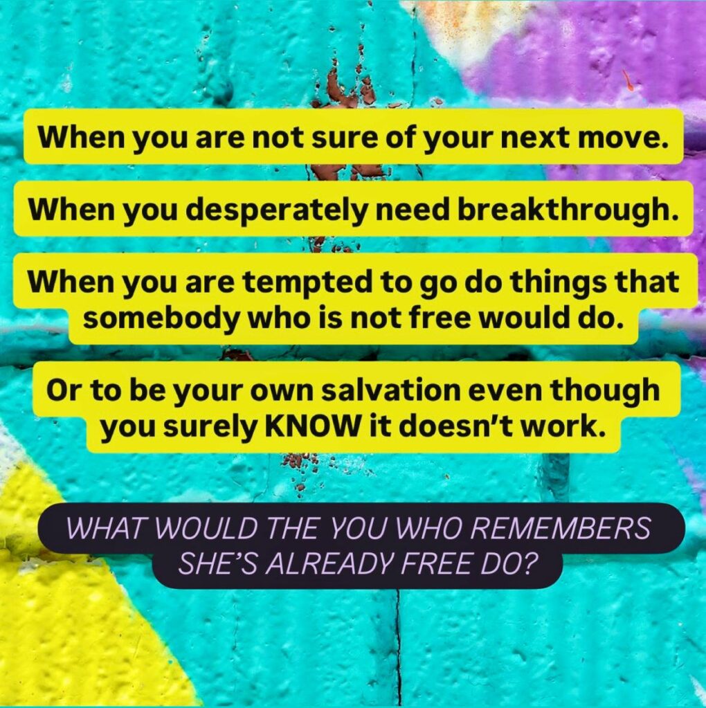 If you have been set free, your status is set to free girl (or guy). It’s your default! It is now who you are. You don’t gotta (can’t!) work to get it. And even when you’re not perfect that didn’t mean you lost it.