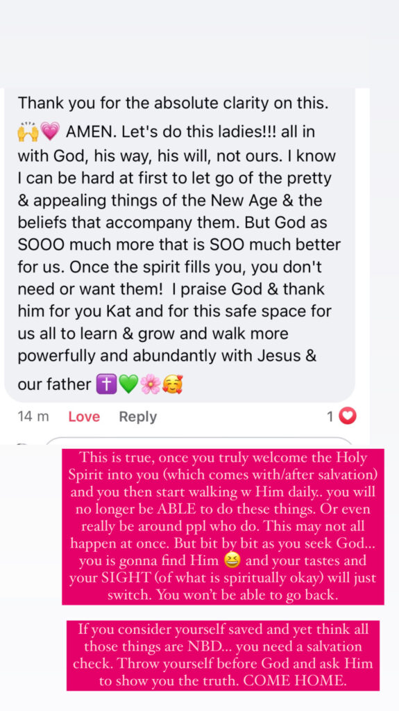 Cards. Crystals for healing or anything other than pretty rocks. ANY energy or spiritual work or healing outside of God. Ceremonial anything. Cacao. Plant medicine. Yoga. Tantra. Manifestation/ law of attraction the worlds way. Which is to say all LOA. Witchcraft. Divination. Psychic anything. Yoni steaming. Numerology. Astrology. Angel numbers. Intuitive readings. ‘Knowing’ in any way. Magick. Anything shamanic. Any use of your spiritual or supernatural gifts outside of God. All New Age practices. Following your hearts desires or your soul if you don’t have God in you and a NEW heart in Him, with your soul firmly PLANTED in Him. Even then no no no to following your soul. Follow Gods SPIRIT, in yours. Yes I used to say follow your soul all the time. I actually meant spirit, I had the wording wrong. And I also have banners in my members dashboards about this and about now being fully faith led.